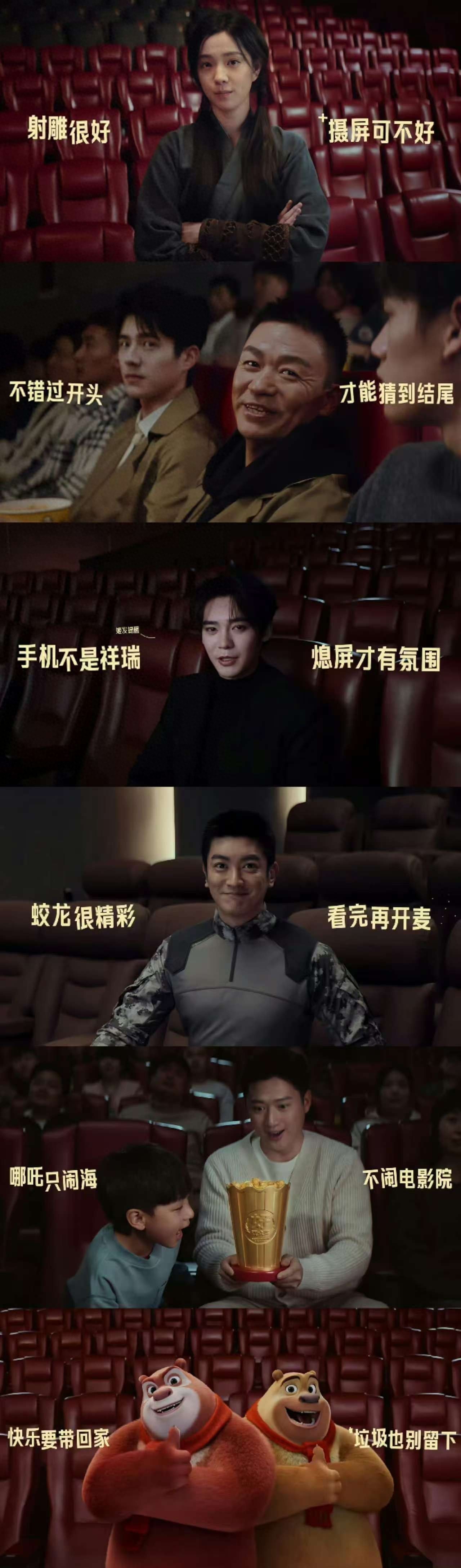 所以六部电影联合发布了“好观众公约”,每个电影都打出一句口号,针对屏摄、迟到、看手机、交谈、小朋友哭闹等影院里各种让人头疼的行为提出倡导。《射雕英雄传:侠之大者》是“射雕很好,摄屏可不好。”《唐探1900》是“不错过开头,才能猜到结尾”《封神第二部:战火西岐》是“说记不是祥瑞,熄屏才有氛围”,《蛟龙行动》是“蛟龙很精彩,看完再开麦”,《哪吒之魔童闹海》是“哪吒只闹海,不闹电影院”,《熊出没》是“快乐要带回家,垃圾也别留下”。